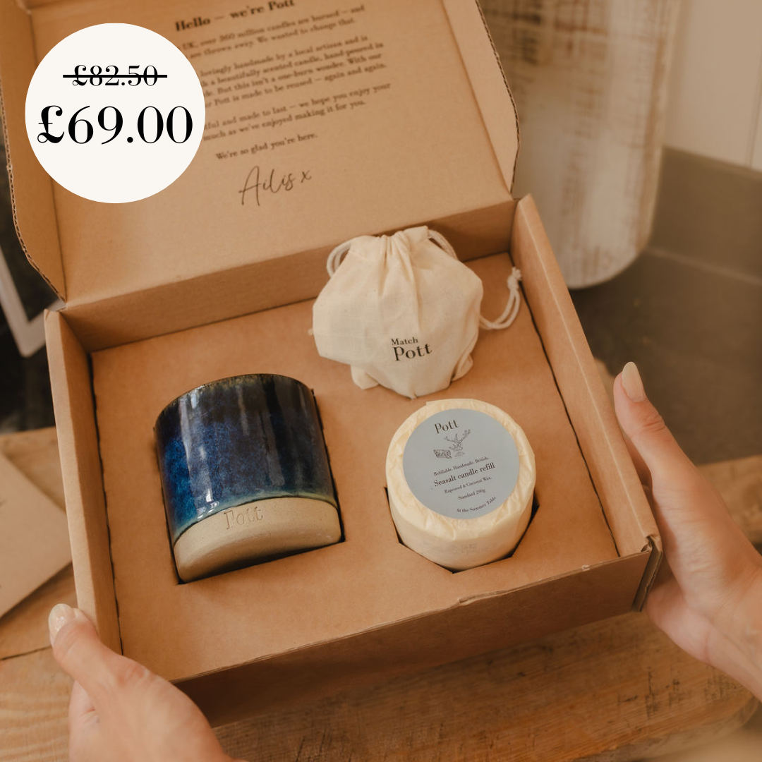 Everything you need to get you going. Your refillable Pott, first refill, matching MatchPott and matchsticks.