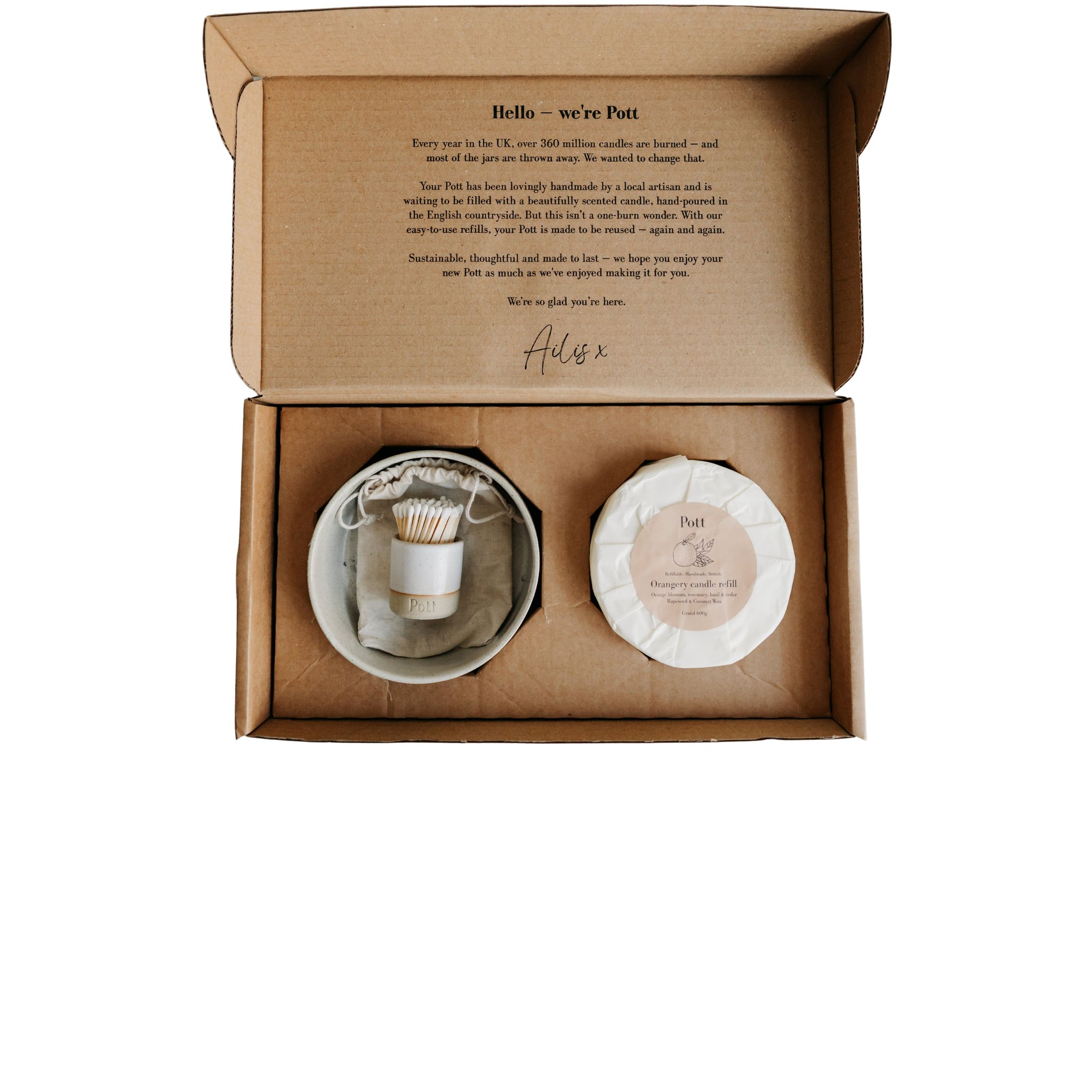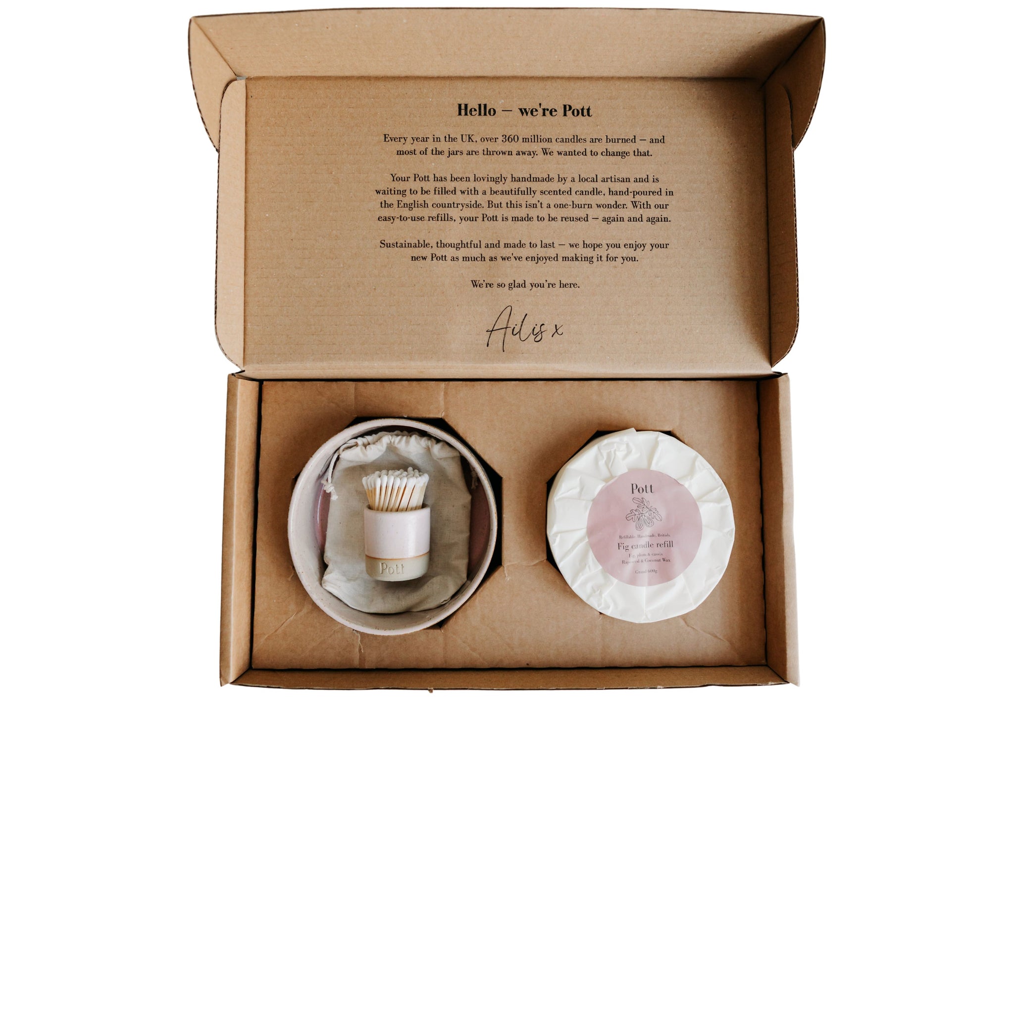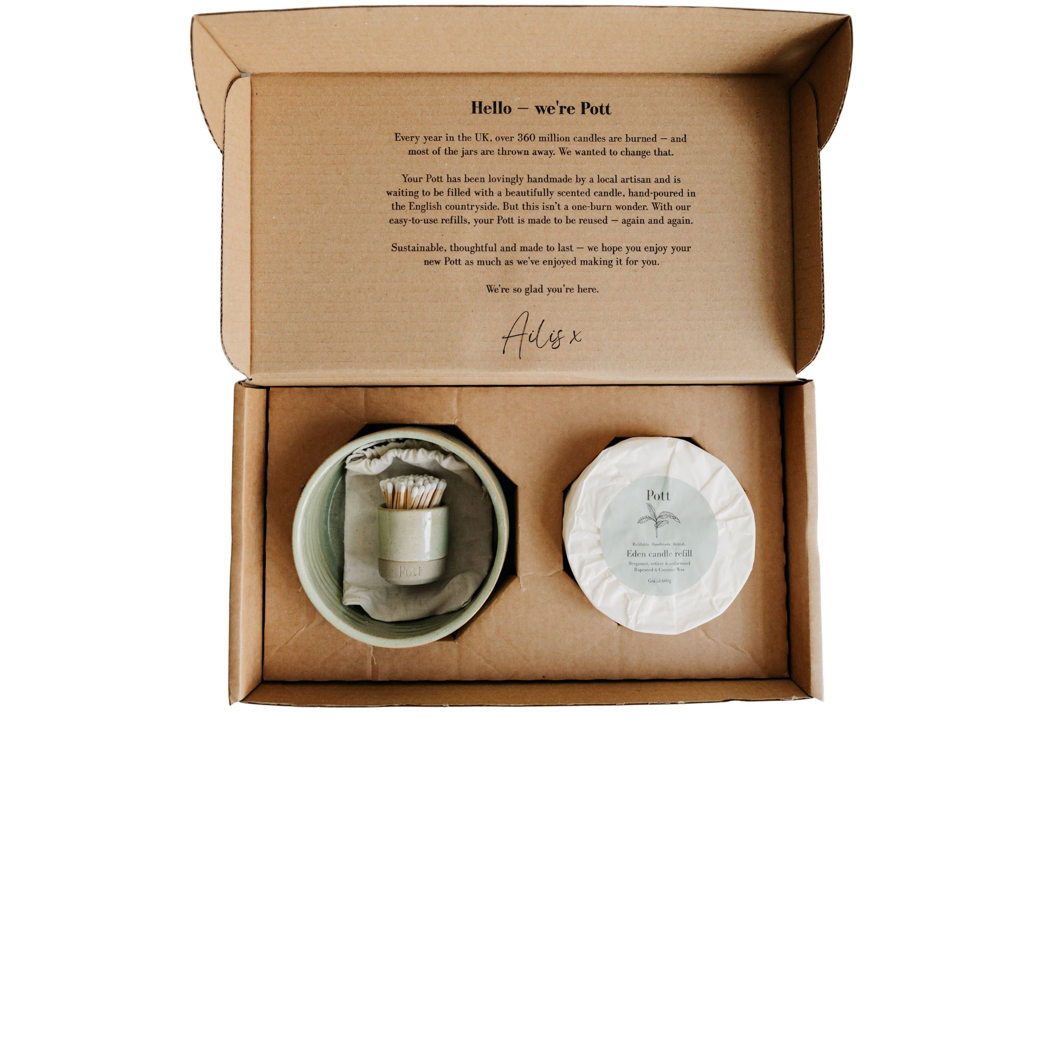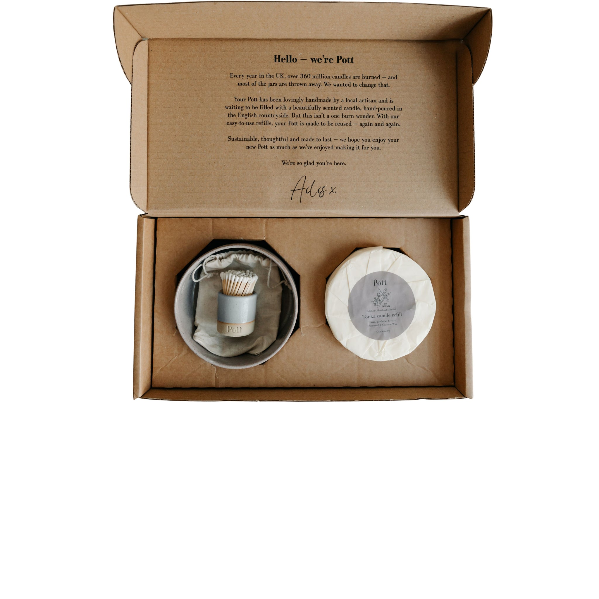 Our new Grand Starter Pack contains everything you need to get you going with your refillable candle! It includes our grand refillable Pott, your first refill scent and a matching coloured MatchPott.