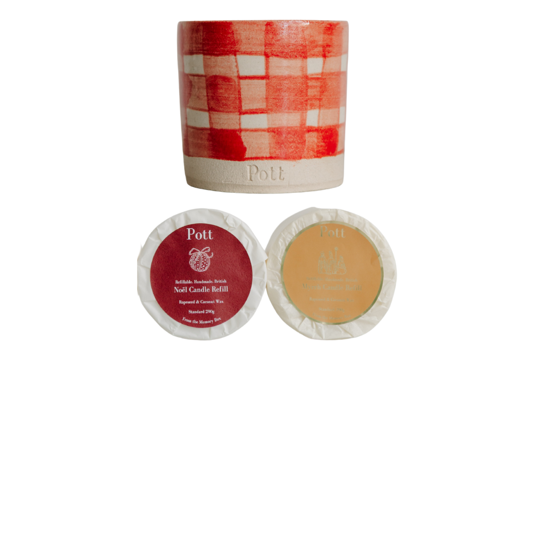 This Standard Pott is a handpainted gingham pattern with a glossy finish. It has been handmade by local artisan potters. Comes with two refills: