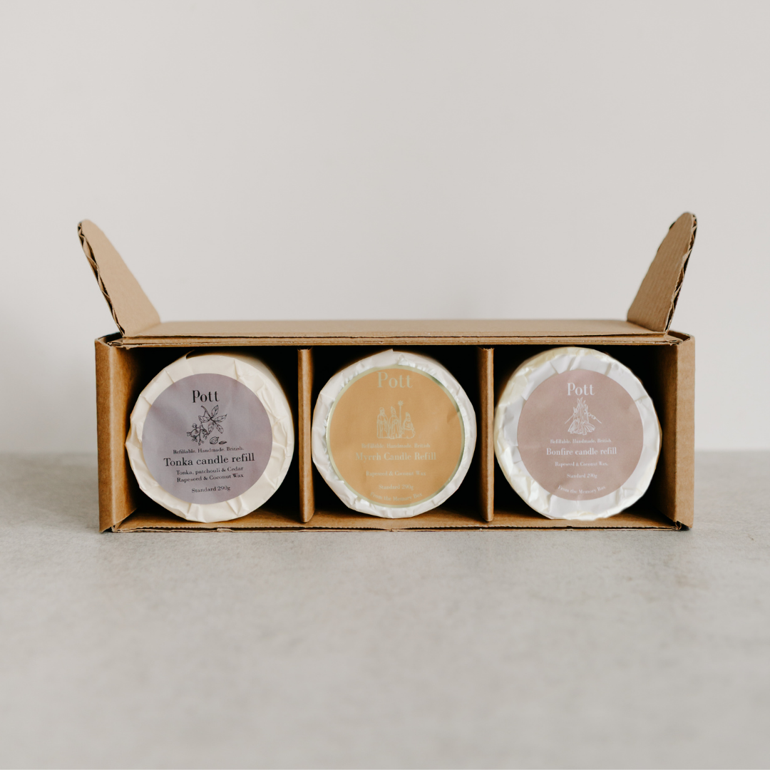 These standard refills are 290g and have a burn time of 60 hours. They are made for our standard Potts, which you can shop here