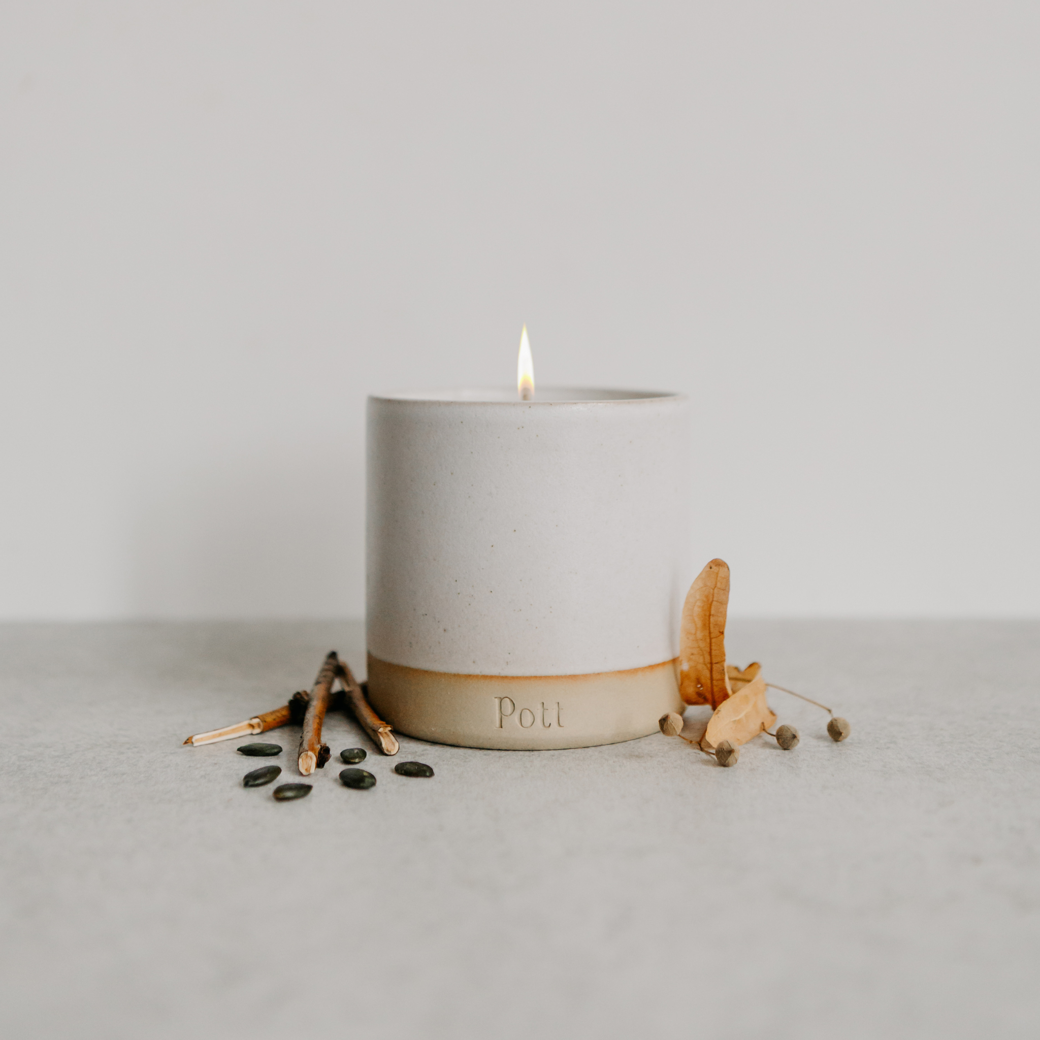 Refillable standard off-white ceramic candle vessel paired with our earthy Bonfire scent.