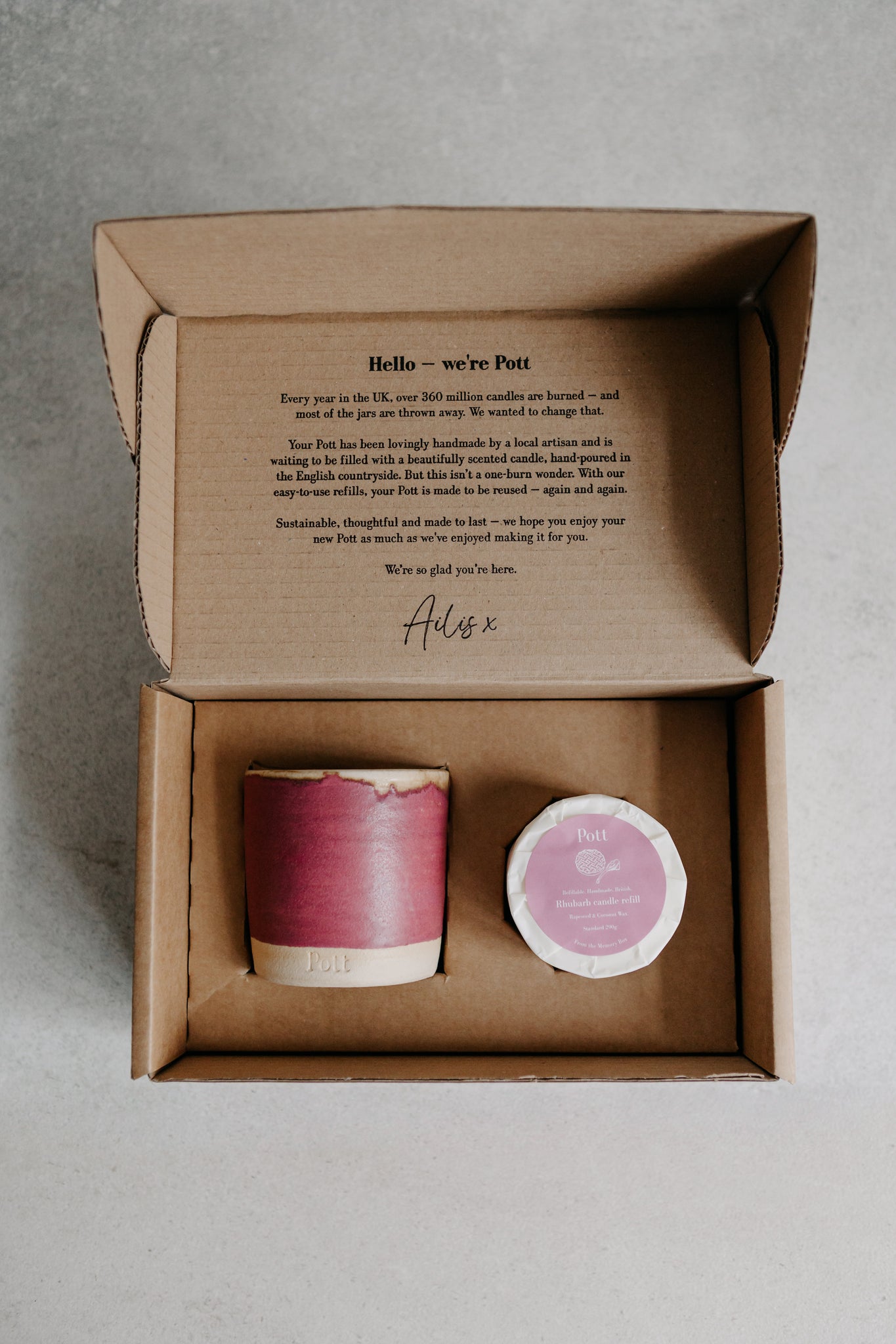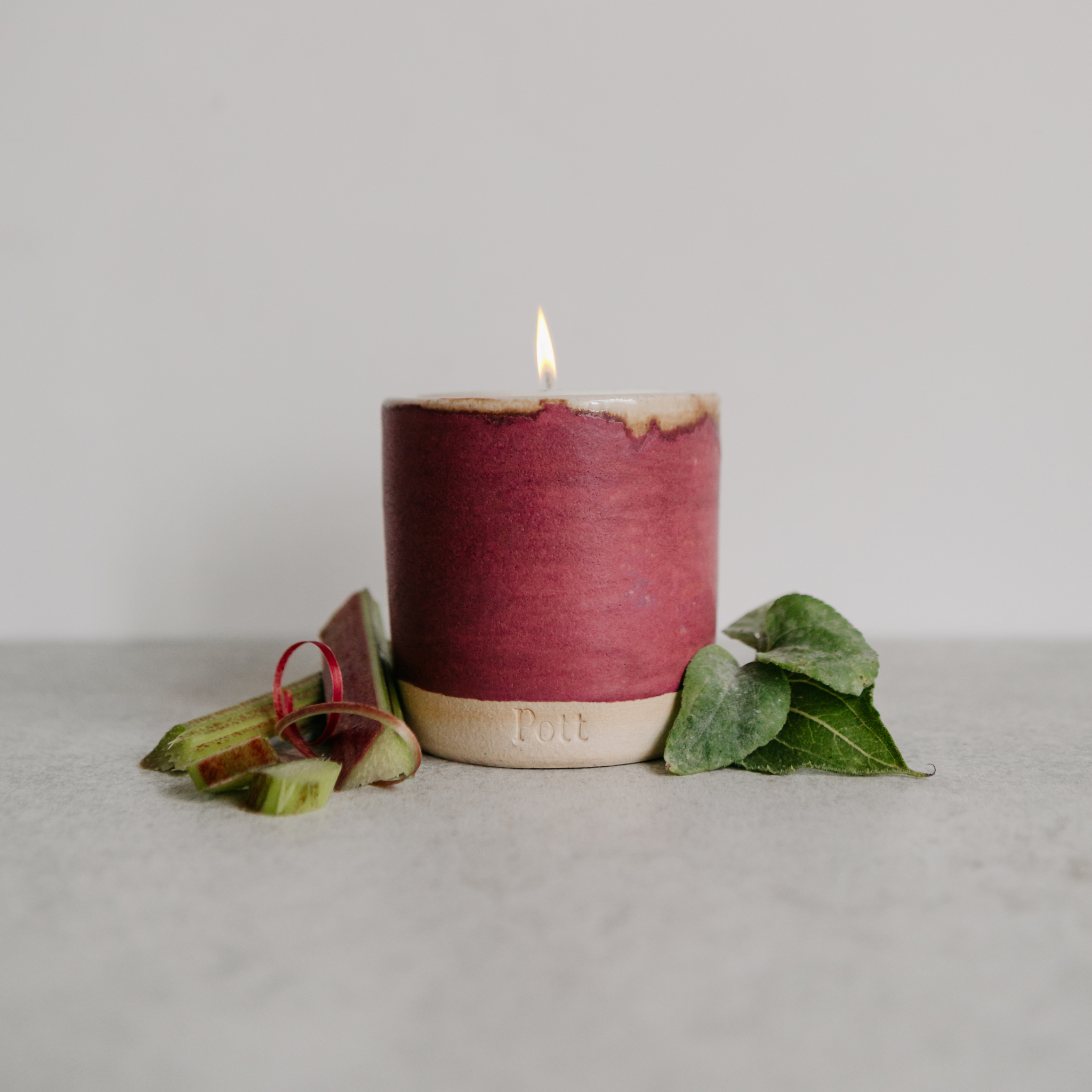 Limited edition, refillable standard ceramic candle vessel paired with our seasonal scent, Rhubarb. This collection was made by British potter, Charlotte Manser.