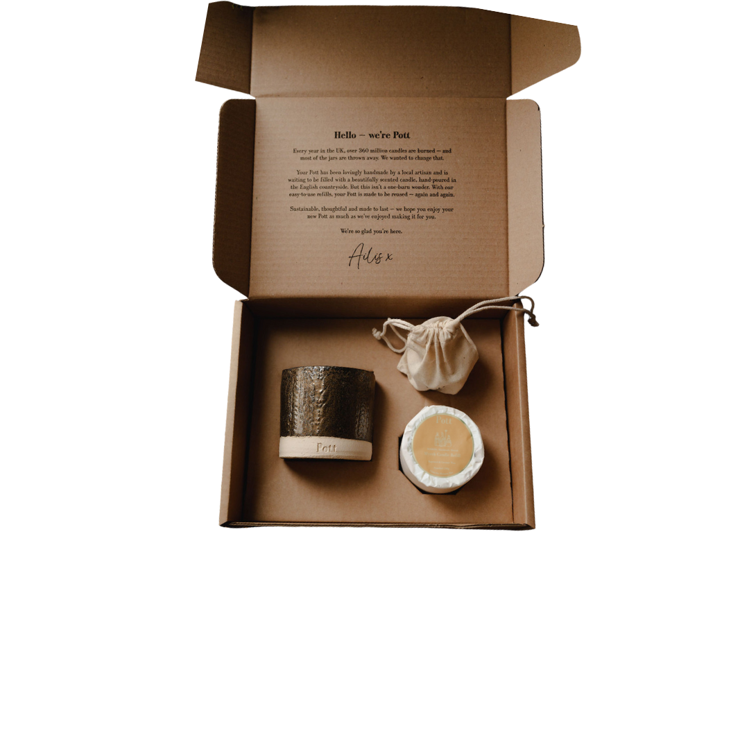 Our Christmas Starter Pack contains everything you need to get you going with your refillable candle! It includes our best-selling Standard size refillable Pott, your first refill scent, and a matching coloured MatchPott.