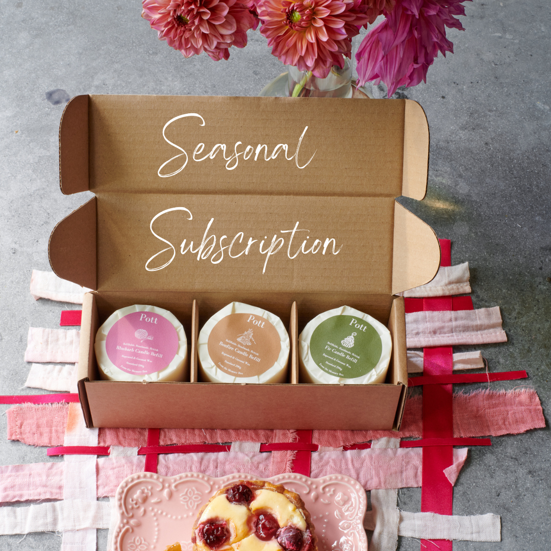 In this subscription, you'll receive 1 box, every 3 months and will be delivered in a beautiful box, directly to your door. It will take you on a scent journey, with scents picked perfectly to pair with the Season, so that you can get the most out of your Pott, all year round.