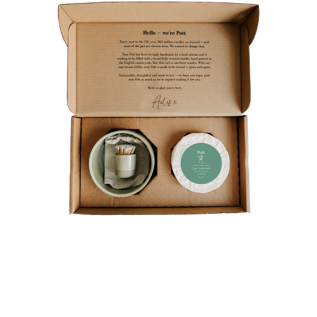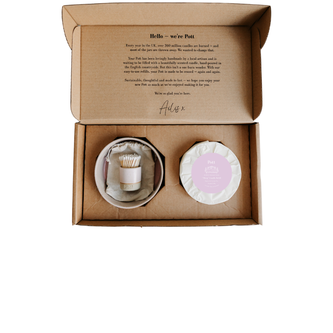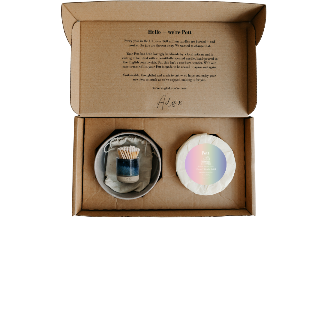 Our Grand Starter Pack contains everything you need to get you going with your refillable candle! It includes our Grand size refillable Pott, your first 600g refill scent (70 hour burn time) and a matching coloured MatchPott.