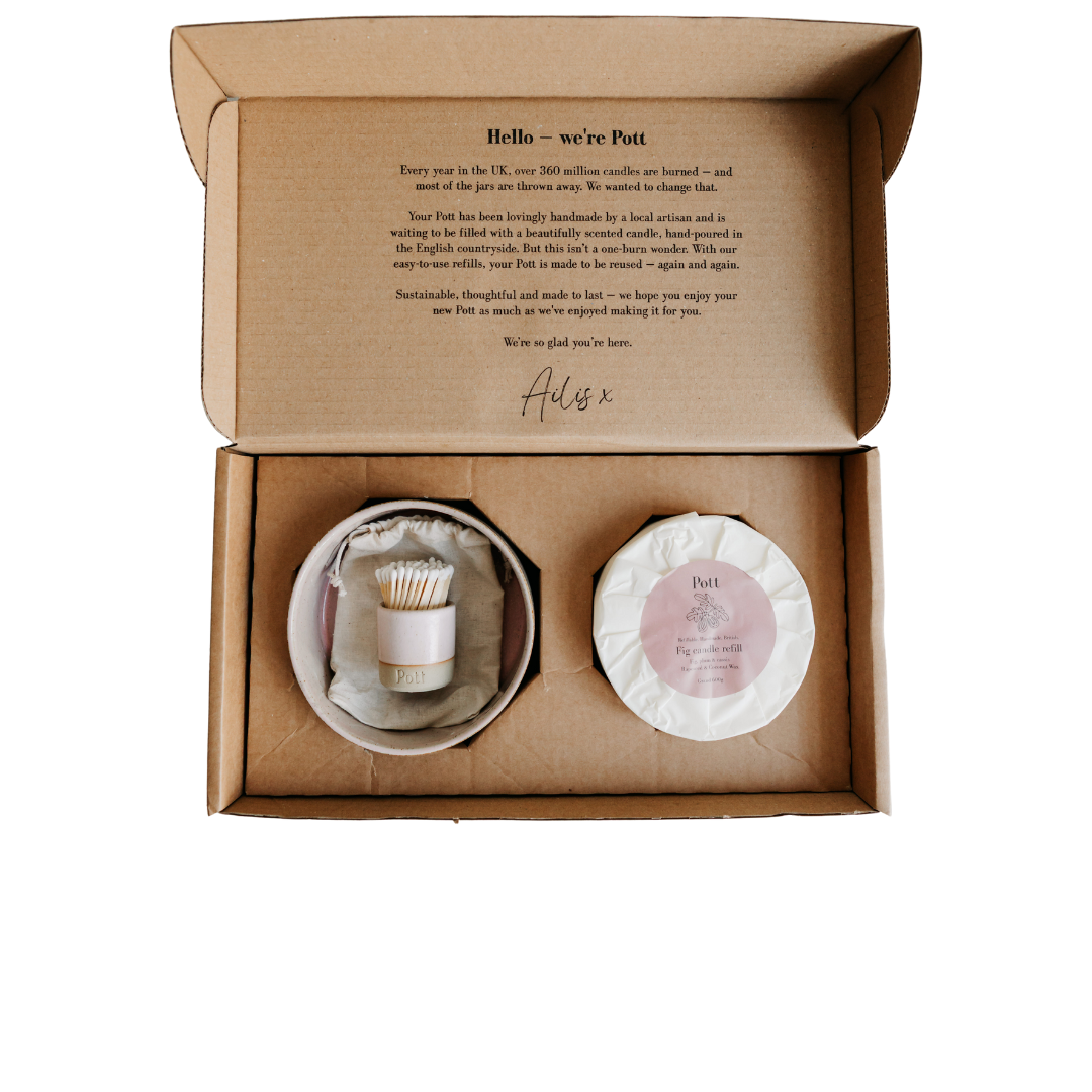 Our new Grand Starter Pack contains everything you need to get you going with your refillable candle! It includes our grand refillable Pott, your first refill scent and a matching coloured MatchPott.
