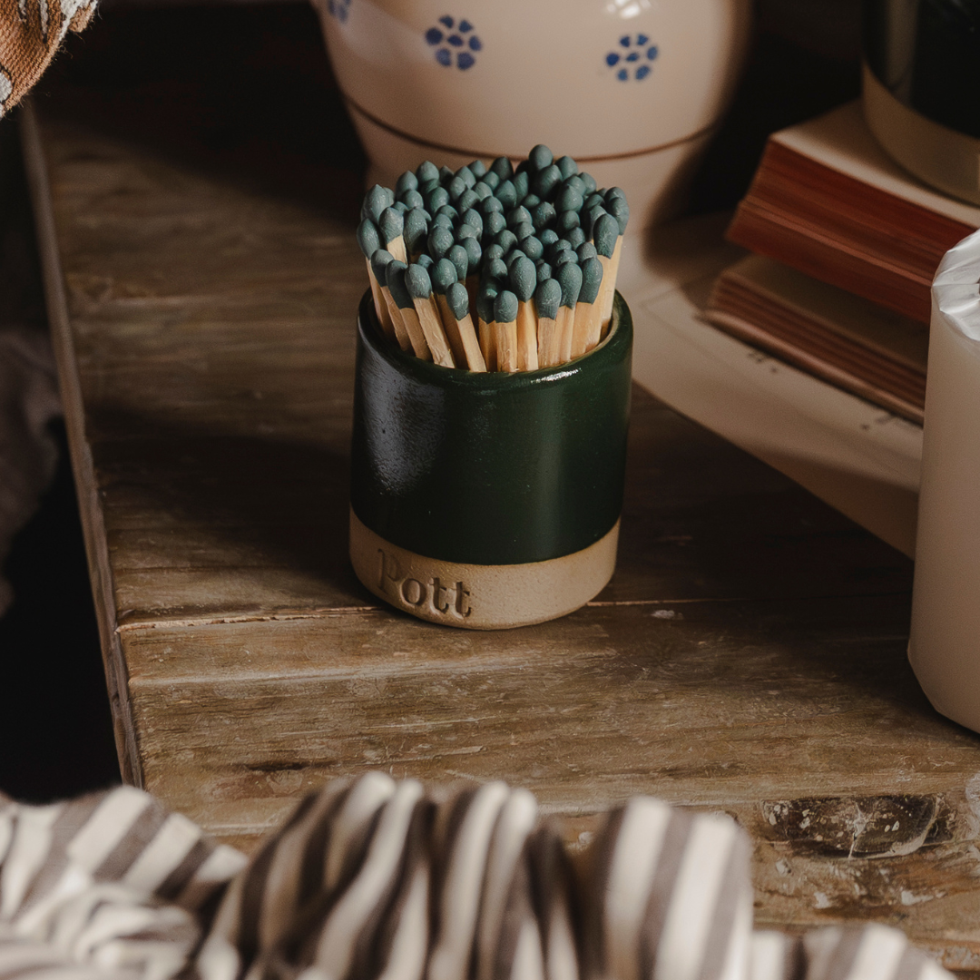 This MatchPott is a traditional dark green with a glossy finish. It has been handmade by local artisan potters. It comes with a striker pad and 80 matchsticks.