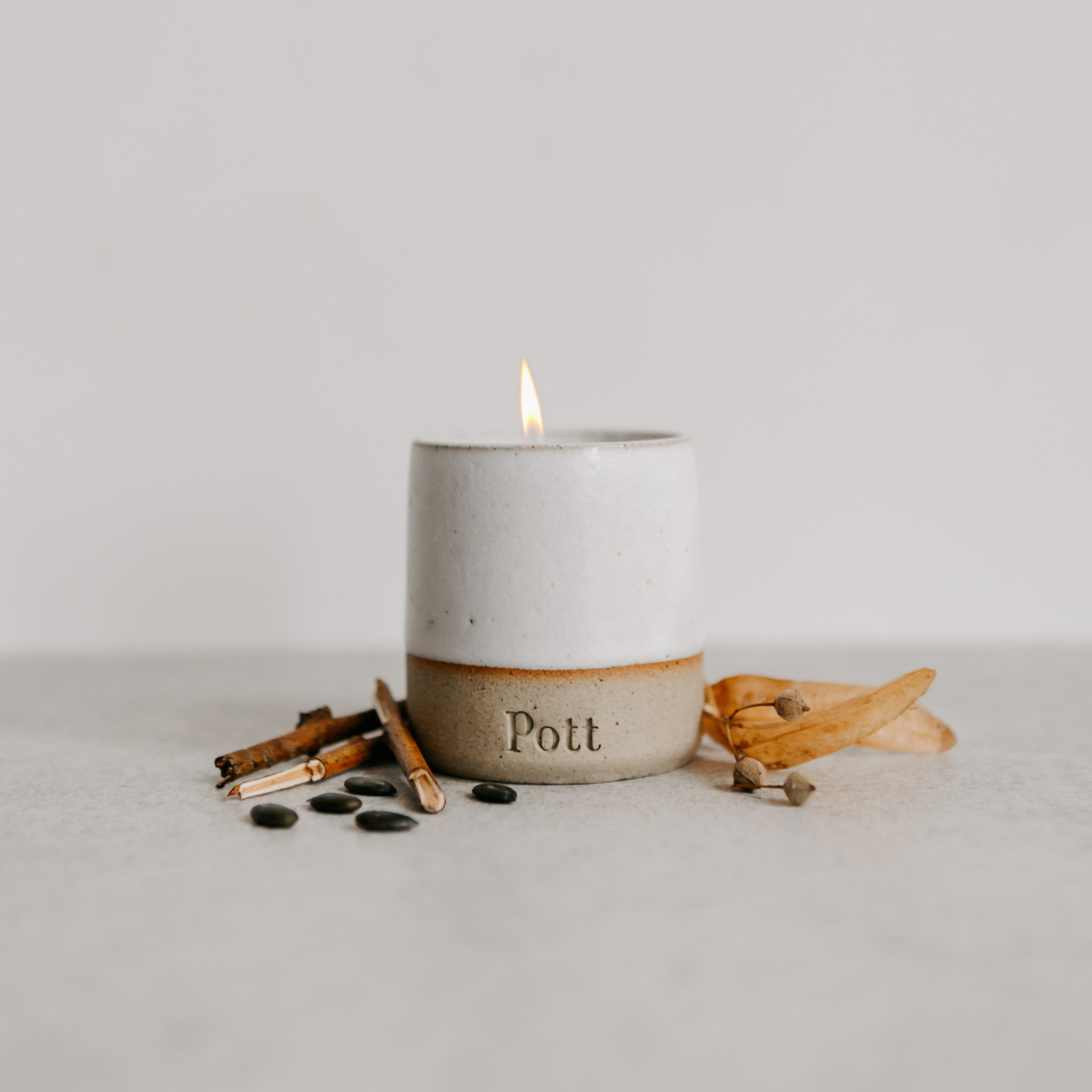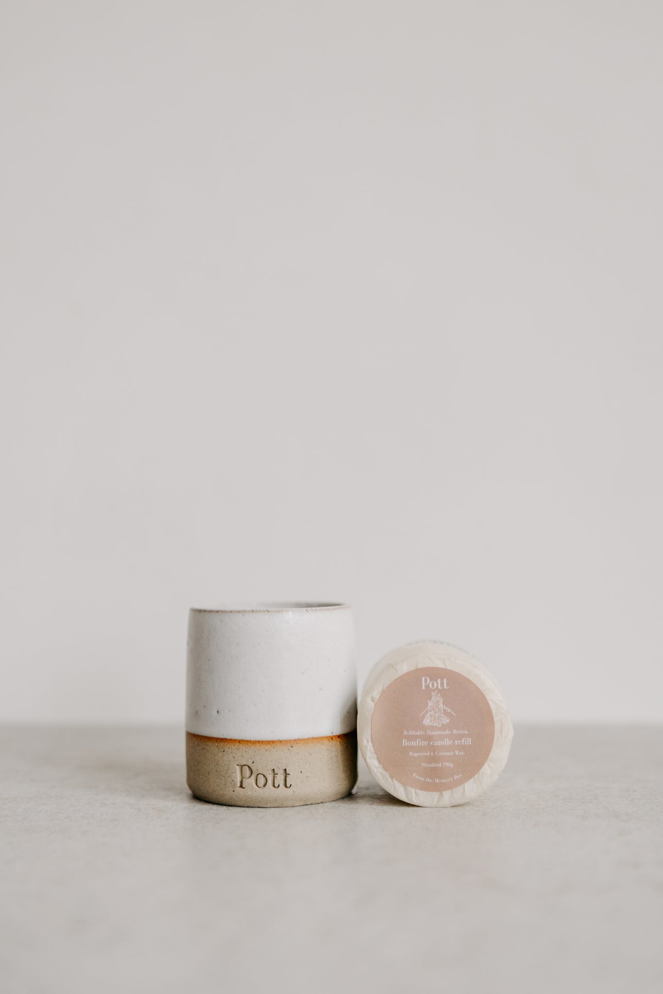 Refillable petite off-white ceramic candle vessel paired with our earthy Bonfire scent.