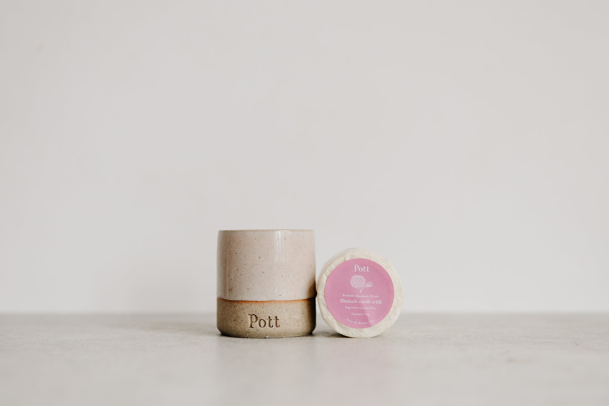 Refillable small blush pink ceramic candle vessel paired with our seasonal scent, Rhubarb.